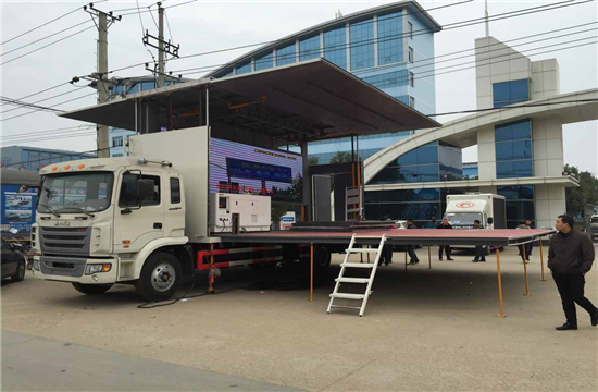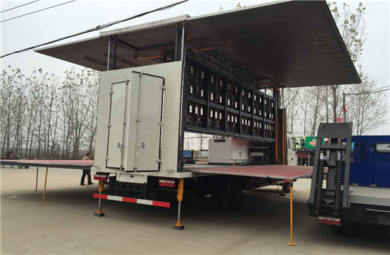 | 整车说明: | 整车长为9650时对应的前悬/后悬(mm):1400/3250,接近角/离去角:18/13,整备质量为12550;整车长为9000时对应的前悬/后悬(mm):1400/2600,接近角/离去角:18/15,整备质量为11550;整车长为8700时对应的前悬/后悬(mm):1400/2300,接近角/离去角:18/16整备质量为11550;1.随底盘选装驾驶室;舞台部分关闭时,顶部封闭;2.箱体两侧可按用户要求喷涂或黏贴各种图案,可选装车厢两侧LED屏结构,可设置多个窗户或不开窗;后门可选双门或不开门结构,后部可选装后尾部提升板。3.厢体展开结构:两侧及后部可展开或顶棚可升降,顶部可选装太阳能板;4.专用装置:折叠式平台,支腿,顶棚;5.专用功能分两种:专用功能①:车厢顶棚封闭,并采用衍架结构,可升降,车厢两侧板可展开,与顶棚形成整车舞台顶棚;活动舞台板可折叠于车厢内,通过展开装置展后与固定舞台台面形成整车舞台台面;底盘大梁部分设有支撑装置。该车是进行舞台文艺表演的专用车辆。专用功能②:作业时前侧厢可伸出,后侧板及顶板(部分)向上展开,内侧板及后板向下展开平铺后,可形成用平台的地板,带有可向上展开的顶板(部分)时,顶板向上举升;6.侧防护和后防护可选装裙板焊接结构;7.侧面及后下部防护装置材料为Q235,采用焊接连接,截面为110×50mm,离地高520mm。允许局部结构外观有变化,车辆颜色和文字喷涂位置可变化。ABS控制器型号/生产企业:VIE ABS-II/浙江万安科技股份有限公司;安装具有卫星定位功能的行驶记录仪。 | ||