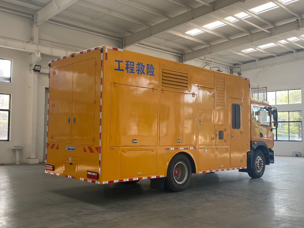 整车说明: 车厢顶部封闭,不可开启。车辆主要专用装置:装有静音车厢、发电机组、电缆卷盘、救险设备等,内部可选装电驱式排水泵或柴油机驱动式水泵或液压水泵。专用功能及装置:发电机机组,远距离输电装置,电焊机以及应急抢险抢修时必备的光源,气源,电源设备,整车长/轴距/后悬对应关系为(mm):8680/4700/2720,8480/4500/2720,8180/4500/2420,7910/3950/2700,7610/3950/2400;防护材料为Q235碳钢,侧面防护由裙板结构构成,,离地高度430mm,后下防护采用螺栓连接,断面尺寸为Φ120mm,下缘离地高500mm;ABS系统生产厂家,型号 :焦作博瑞克控制技术有限公司,J ABS;襄阳东风隆诚机械有限责任公司,ABS/ASR-24V-4S/4M。安装液压尾板:后部尾板收起状态的水平长度是300mm,尾板质量为440kg。选装上装新外形,选装不带尾板。