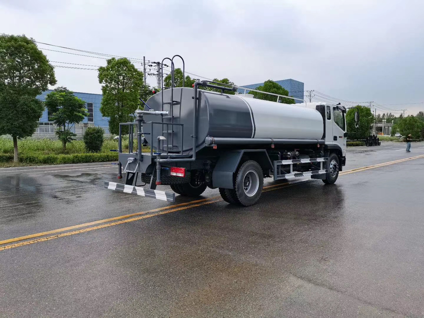 整车说明: 随底盘选装驾驶室前脸样式,扩展后部结构样式,仅采用4500mm轴距,有效容积:11.34立方米,罐体外形尺寸(长×长轴×短轴)(mm)为:5200×2300×1420,5200×2300×1410;主要装置为水罐,洒水泵,主要用于城市洒水、压尘; ABS型号为CM4XL-4S/4M,生产厂家为广州瑞立科密汽车电子股份有限公司.;侧面防护装置材料材质:Q235,连接方式:螺栓连接;后下部防护装置材料材质:Q235,连接方式:螺栓连接,断面尺寸(宽×高):50×120(mm),离地高度:460mm.