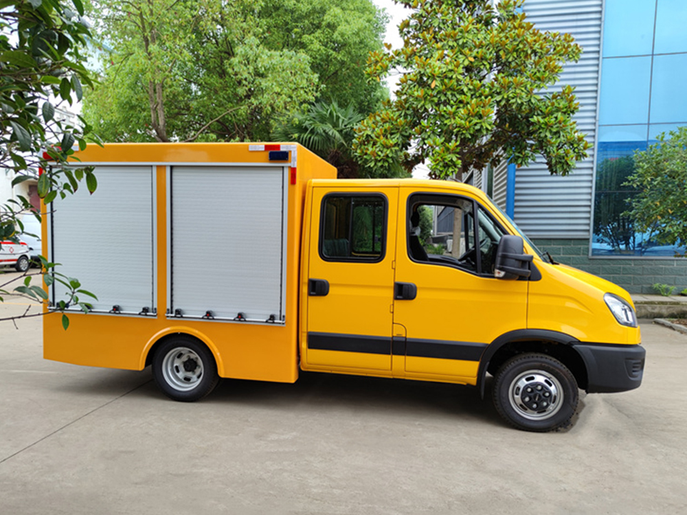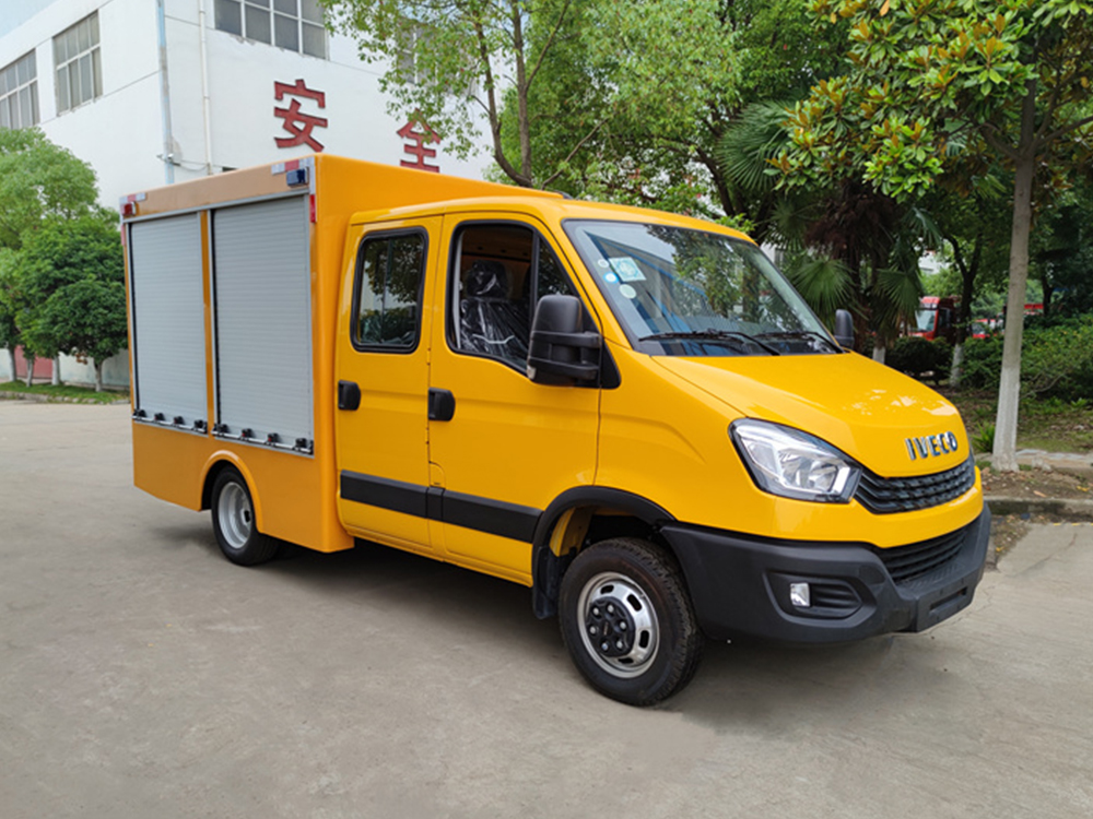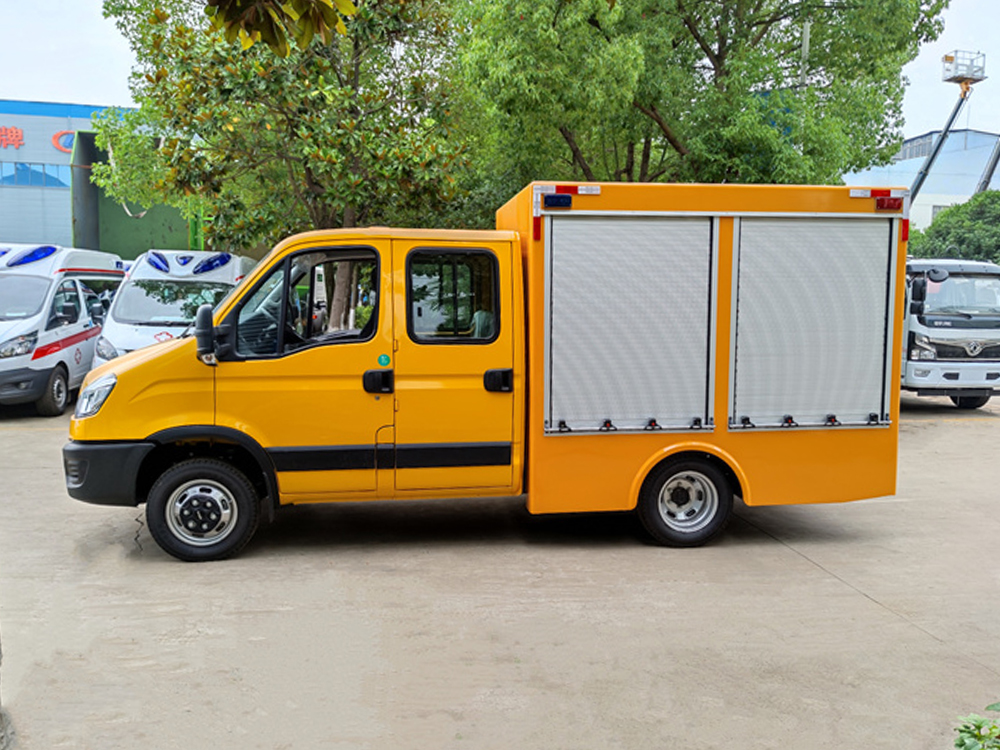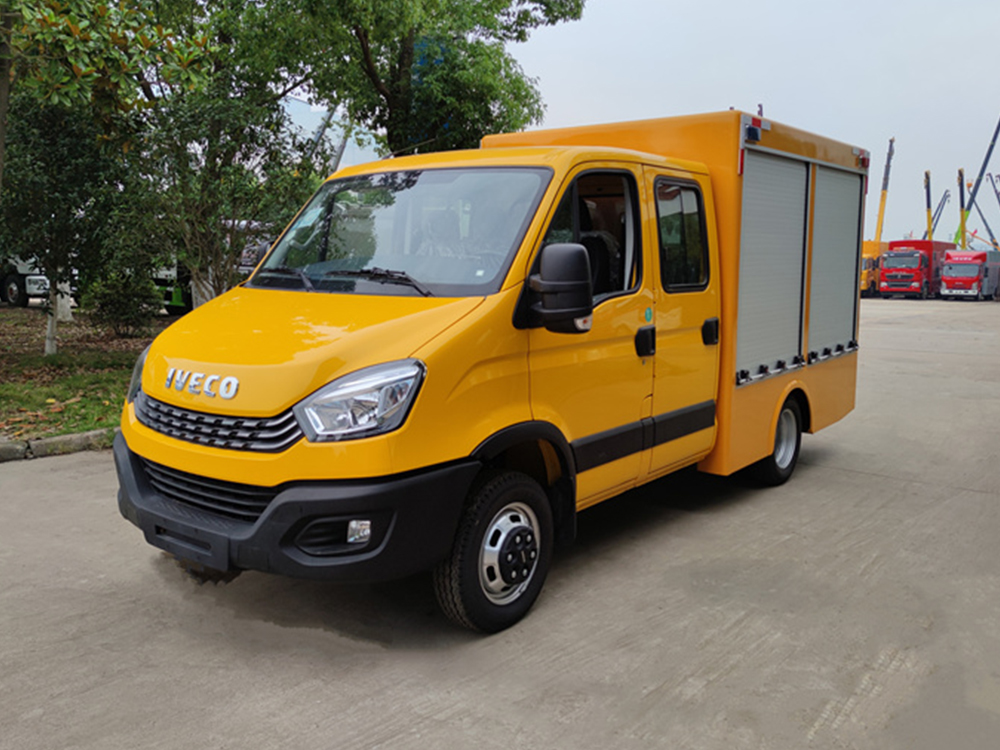 依维柯双排救险车-流量1000方每小时,该车配备工程标识灯、发电机组、空压机、电焊机、等离子系统等专用设备及控制系统,主要用于应急救险救援,应急排水作业。