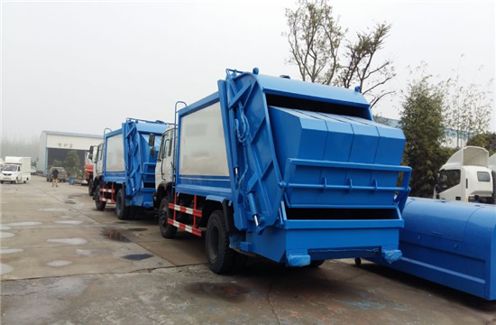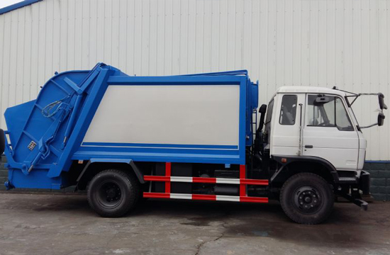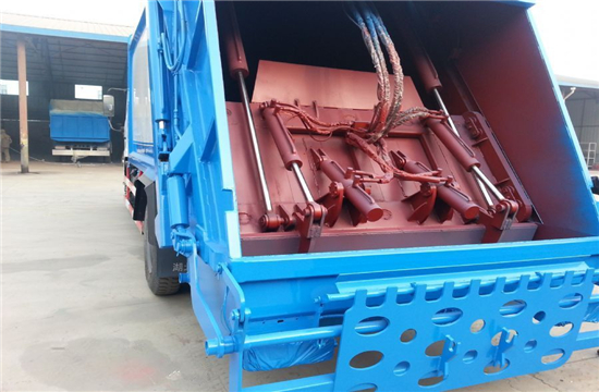 厢体材料为优质炭钢,厚度为5mm,厢体容积为10立方米。由装料机构、压缩机构、卸料机构、油泵、油箱、控制阀等组成的液压机构组成。装料机构由支架、连杆机构、凸轮、挂钩等组成,在油缸作用下,将垃圾桶内的垃圾自动翻转倒入料斗内。