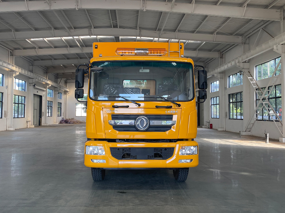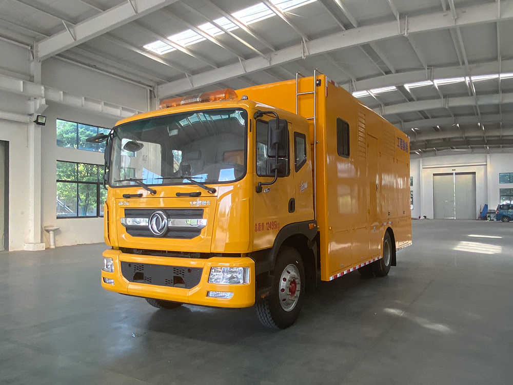 整车说明: 车厢顶部封闭,不可开启。车辆主要专用装置:装有静音车厢、发电机组、电缆卷盘、救险设备等,内部可选装电驱式排水泵或柴油机驱动式水泵或液压水泵。专用功能及装置:发电机机组,远距离输电装置,电焊机以及应急抢险抢修时必备的光源,气源,电源设备,整车长/轴距/后悬对应关系为(mm):8680/4700/2720,8480/4500/2720,8180/4500/2420,7910/3950/2700,7610/3950/2400;防护材料为Q235碳钢,侧面防护由裙板结构构成,,离地高度430mm,后下防护采用螺栓连接,断面尺寸为Φ120mm,下缘离地高500mm;ABS系统生产厂家,型号 :焦作博瑞克控制技术有限公司,J ABS;襄阳东风隆诚机械有限责任公司,ABS/ASR-24V-4S/4M。安装液压尾板:后部尾板收起状态的水平长度是300mm,尾板质量为440kg。选装上装新外形,选装不带尾板。